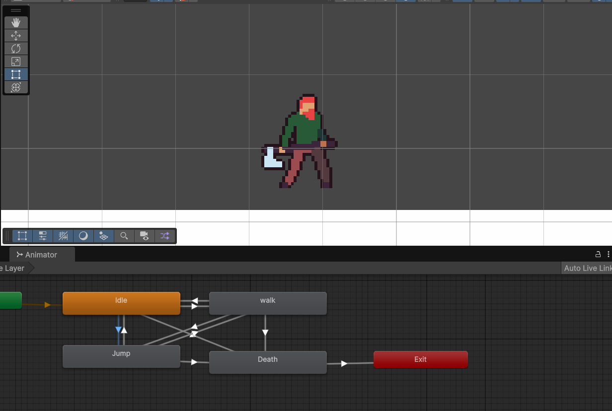 Since I will be the one doing the art on this project I firstly wanted to figure out how some of the tools I will be using inside unity. To do that I downloaded a sprite sheet off the internet to experiment with the animator and how to set up animation. With the sprite sheet I was able to set up four different animation states with each being able to transition between each other. I tested the transitions by creating paths from one state to another by muting some of the transitions to check if everything worked correctly. I tried to set it up to work with player controls but couldn't figure it out just yet so that might be a part of the goal for next week together with a potential self made placeholder character